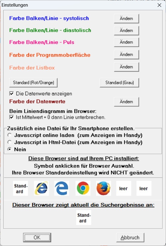 Die Farbe der Oberfläche des Programms ist in Orange. Wenn Ihnen diese Farbe nicht zusagt, können Sie diese einfach mit dem Menüpunkt Einstellungen ändern. Ebenso die Farben der Balken bzw. Linien in der Grafik für die Systole, Diastole und den Puls.